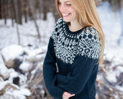 Folkstory is knit in the round from the bottom up. The torso and the sleeves are worked in the round separately, then joined together at the base of the yoke. The yoke is then worked in the round up to the neck.