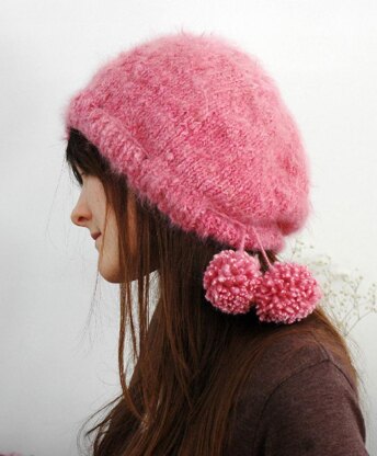 Cozy little snowbunny hat with little bunny-tail-esque pompoms! The angora is ultraluxurious, but you could work it in a smooth aran weight (Malabrigo Twist, perhaps) for a different look.