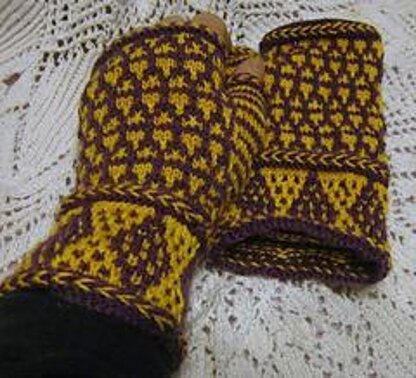 The patterns are simple mosaic stitch patterns, so no knitting or color gymnastics are involved. Even in fingering weight, you will be warm wearing this accessory. The mitts are double warm because the Fool is always cold and needs extra layers. Both patterns are double-warm due to the mosaic layers. These are beautifully patterned mitts for cold weather.