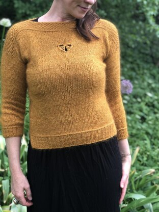 The little lace motif in the center of this sweater is called “Variation Honeybee” from one of Barbara Walker’s stitch dictionaries. I have always loved it so I combined it with my favorite “Honeycomb” brioche stitch for this cute little sweater. A split hem and bracelet length sleeves have made this a go-to piece in my handmade wardrobe. Yarn Su