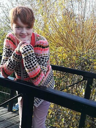 To celebrate a Finland holiday, this pattern is an ode to the wonderful fabric design of Marimekko. Their colorful designs invoke the spirit of the 1960s and 1970s. A stranded design, these rows of colorful dots make for a happy and varied look for a classically shaped cardigan, knit bottom-up and with the reverse contiguous shaping.