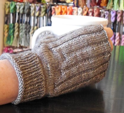 The pattern begins with an easy rolled edge at the base of the cuff. Charted perpendicular lines of reverse stockinette mimic the birch or beech trees of the painting. The thumb gussets are off-set to more correctly fit the human hand.