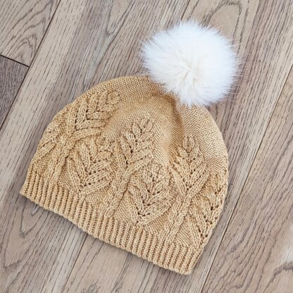 This hat is worked in DK yarn in the round from the bottom up. It starts with a ribbing section. The pattern is then worked from the chart or written instructions. There are two versions for the decreases, one a more fitted hat and one that’s a bit slouchier. Front cover picture shows fitted hat, picture on page 4 shows slouchier hat