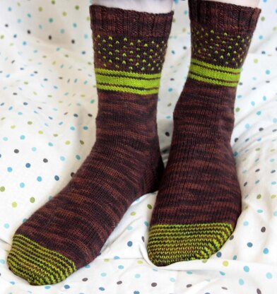 I designed these socks to be the ultimate travel knitting project - easy without being boring, all the while resulting in a pair of socks you'll love to wear. The colorwork lice and stripe pattern at the top of the cuff can be easily memorized (and you can just use your first sock as a reference when knitting sock #2); the striped toe allows you to easily work your toe shaping - all you have to do is remember which color is worked for the decrease round! As an added bonus, they are a great way to use leftover sock yarn, as you only need a small amount for the contrast color.