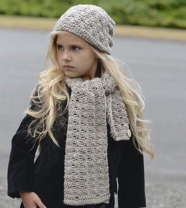 Pattern includes a scarf and two hat options (beanie or slouchy style).