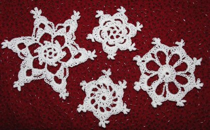 Four easy traditional crochet snowflakes in one pattern. Yes, there are some picots but not too many. Use them as ornaments to decorate a tree, as gift package decorations, or strew them across the center of a table. Written instructions only.