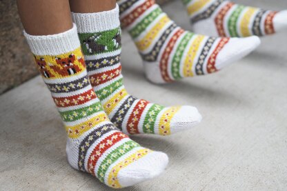Foxes and hares make a marvelously mismatched pair on these bright Fair Isle socks! Worked in the round from the top down, the socks incorporate short rows into the heel shaping and use simple decreases to shape the toes. Colorful bands of Fair Isle circle the upper sock and instep. A second version of the fox and hare charts are included with only two colors per row, for those who choose to use duplicate stitch to add extra colors after knitting is complete.