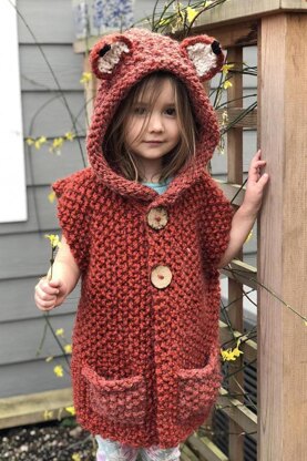 - Each part is worked separately in moss stitch and then sewn together. The design includes optional pockets, a hood, and playful fox ears for a charming touch.