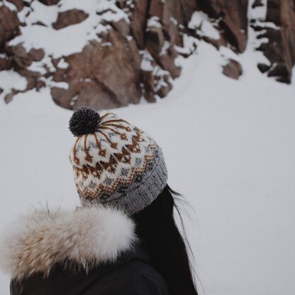 The hat is knitted bottom-up and in the round. It features a folded brim and colourwork throughout. The sizes range from toddler to adult.
