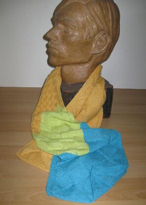 The scarf begins with a set of large blocks which are broken into progressively smaller blocks. The blocks then increase in size again. Because of the way the blocks change size there are places where half a block is worked at a time or you change direction part way across the scarf. Some familiarity with the entrelac technique is advised. A garter stitch border provides a little extra width and a finished edge.