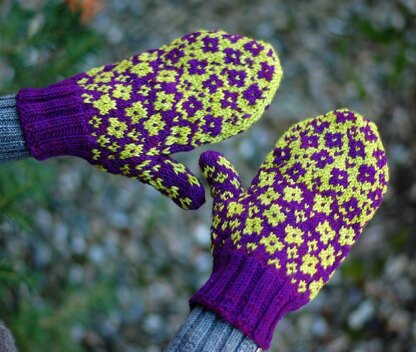 Created to compliment Lyrical Knits’ [Fractured Fairy Tale Hat][1] and [cowl][2], these mittens are worked in 2-color stranded color work in the round. Two sizes in two lengths are offered in heavy sportweight/light DK yarn, but further adjustments in sizing can be achieved by altering the gauge with either needle size and/or weight of the yarn.