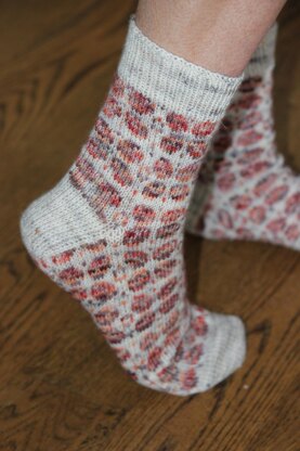 These fair isle socks are worked from the toe up with heel flap and a special gusset at the bottom of the foot. Length and height modifications are simple in toe up construction and are indicated throughout the pattern. The ability to try on as you go helps achieve the perfect fit. The stranded colorwork is very simple and enjoyable with small floats easy repeats.