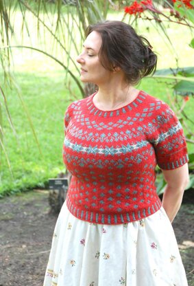 This is a pattern for a circular yoked tee, worked from the top down and in the round, using the Fair-Isle knitting technique. Stitches are cast on for the neck, working a corrugated rib before shaping. The yoke is worked then sleeve stitches are separated from body, then the body and each sleeve is worked using charts. Sleeves and bottom edges are worked with a corrugated rib before being bound off.