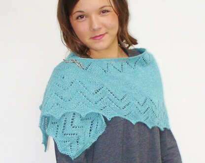 Skill Level: Intermediate Required Skills: Reading a chart, working short rows One sizeFinished Measurements: 58"/143.3cm wingspan by wide by 12"/30.5cm height Gauge: 23 sts and 32 rows = 4"/10cm in stockinette stitch. Gauge is not critical in this pattern, but a different gauge will affect yardage and size of finished garment. It may be necessary to unravel gauge swatch and re-use the yarn. Take time to check gauge. Materials:Yarn: Linen or linen blend sport or fingering weight yarn, 400 yards. Models shown in Plymouth Yarn Linaza (50% Alpaca, 25% Linen, 25% Tencel; 440yds/100g) colors 201 Cream, 1 skein, and 1641 Robins Egg, 1 skein Needles: US 5/3.75mm 30" circular, or size needed to obtain gauge 2 stitch markers Yarn needle