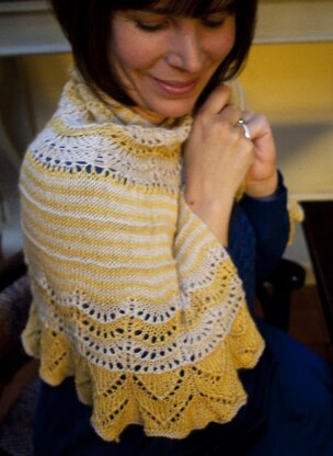 The Frangipani Shawl, inspired by tropical flowers, will bring a ray of sunshine to a cold winter day. This semicircular shawl is knit in two colours of sockweight yarn, in a luxurious alpaca, silk, cashmere blend that will drape beautifully across your shoulders or wrap warmly around your neck like a scarf. The combination of stripes and simple lace patterns make this shawl a fun, relaxing knit.