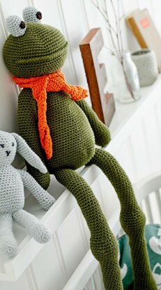 Frank the frog is approx 64 cm tall if made with the recommended yarn