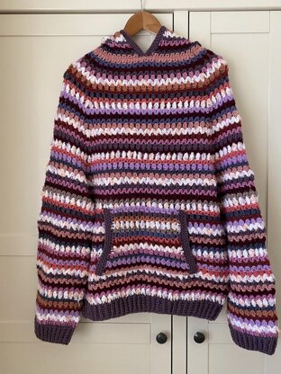 The pattern gives details to make this generously sized hoodie, worked in one piece for body and sleeves, with the hood and pocket added. The stripes are created using a zigzag stitch, which is written. Charts are included to support with the raglan & pocket shapings.