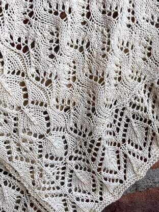 This rectangular stole features lace patterns representing the Ash tree: Drooping clusters of seed pods, elegant tooth-edged leaves, and small diamonds representing new growth. The first border is cast on and knit, and then the body of the stole is completed. Stitches are left on hold while the second border is knit. The two sections are then grafted together at the live stitches to finish the stole. Note that all lace is presented in CHART FORM ONLY.