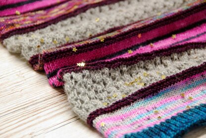 To knit the cowl you need approx. 550–710 yd or 500–650 m of fingering-weight scraps, leftovers, samples, mini skeins, half skeins, gradient sets, or unicorn tails in as many colors as you like. For a drapey cowl, use single-ply yarns, such as superwash merino. For an airy and ethereal look, use mohair or brushed alpaca for the lace sections.