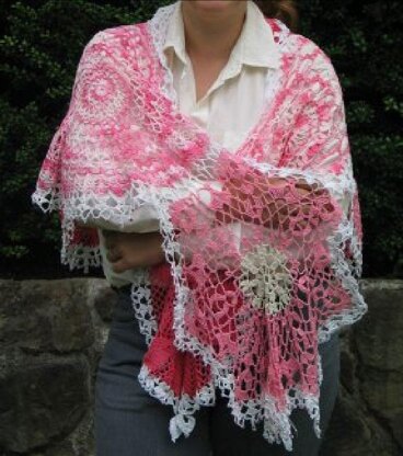 Make a beautiful wrap out of doilies you've purchased or made yourself - a wonderful way to use new or heirloom doilies. The instructions tell you how to select the doilies, lay out the wrap (with sample diagrams), attach the doilies to each other, and crochet a border with beads and dangles. No instructions for doilies are included. Materials required: • Doilies of various sizes in a harmonious color scheme. The sample pictured uses 8 doilies between 6” (15 cm) and 21” (53 cm) in diameter. Note: The number of doilies you need depends on the size of the doilies and the size of the wrap that you want to make. • Approximately 300 yards (274 meters) of cotton crochet thread in a complimentary size and color to the doilies; • Approximately 275 small beads in matching colors with a center hole large enough to fit easily onto the crochet thread. STITCHES USED: Chain st (ch). Slip st (sl st). Single crochet (sc). Double crochet (dc). Triple crochet (tr). Double triple crochet (dtr).