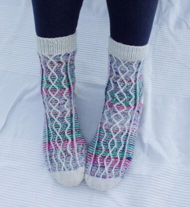 - Listed with Regia yarn. Sampled sock have used Regia 4 ply and Lana Grossa Meilenwelt Merino (striping yarn)