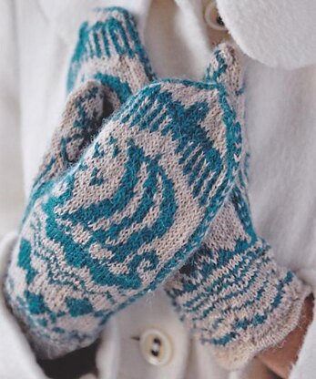 These mittens draw their inspiration from the beautiful Selbu knitting but with some notable departures – the motifs and the thumb shaping. However, they do retain a traditional Selbu eyelet rib and the pattern on the palm. The longship and eagle have a Scandanavian flavour while the fish and seahorse - full of mystique even though it is only a curled pipefish – are just there to make you smile. The mittens are knitted in the round and there is no grafting – just draw up the top and thumb sts and fasten off. Some weaving in is necessary due to the otherwise long floats but no special skill, other than being comfortable with Fair Isle technique, is necessary.