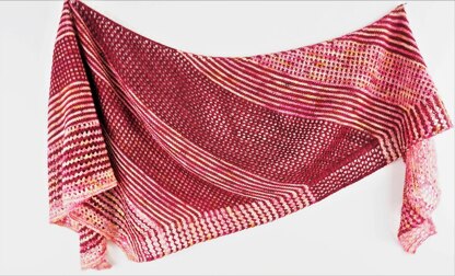 This shawl is boomerang-shaped and is worked from smaller to larger size. It consists of garter stitch stripes coupled with a simple lace pattern and slipped stitches. A lace edging is also created along the long edge as part of the shawl. This shawl uses two skeins of fingering weight yarn, each a minimum of 390 yards.