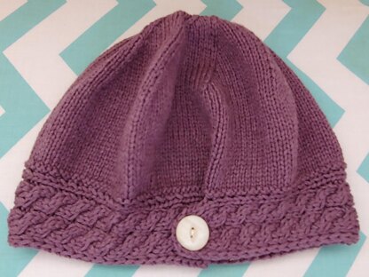 This hat pattern is designed to make a hat that fits well. The pattern starts with a cable band made the circumference of your head, with a buttonhole. Stitches are then picked up for the crown and knit in stockinette.
