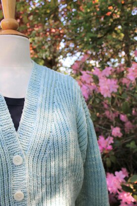 Frihed is a short/slightly cropped cardigan worked from the bottom edge and up with with an all over ribbed brioche pattern. The cardigan has long sleeves (modified drop shoulders).