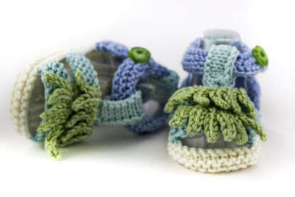 Pattern features garter stitch sole, enclosed heel, comfy front straps and buttoned ankle strap.