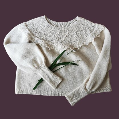 The Frosted Leaves Blouse is a round neck, cropped length sweater with a leaf lace yoke which is trimmed with a leaf lace edging. It is inspired by the beautiful shirtwaists of the Edwardian era, reimagined in soft, comforting knitting.