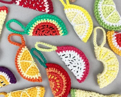 | One size only: | Slices are 5.5cm (not including loop) when using 3mm hook and DK cotton yarn. |