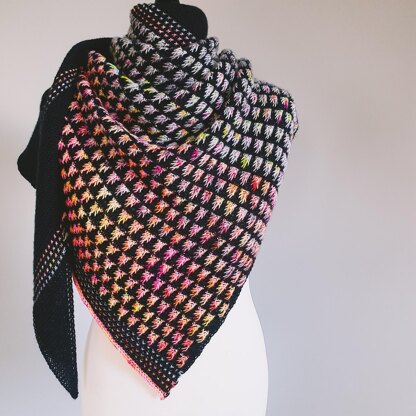 Black for the coal, gray for the ash, orange for the fire. The fire is framed by many small sparks of fire flying over the shawl.