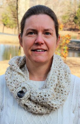This infinity scarf pattern uses basic stitches in a unique pattern to create a fun design. A buttoned clasp adds to the overall finished look.