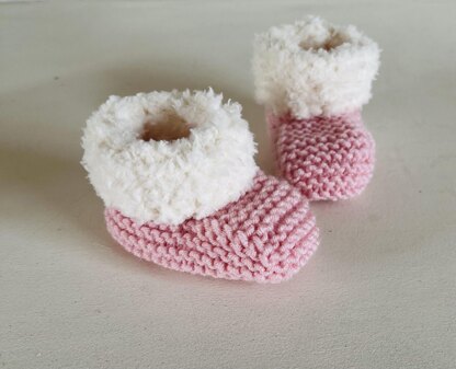 Knit these cute baby booties with a deep fur trim ankle cuff. This pattern is suitable for a beginner knitter who has mastered the basic knitting techniques to the more established knitter who wants an easy to follow row-by-row knitting pattern. These booties are quick to knit up and would make a lovely baby gift or used for pregnancy/gender reveal, as well as keeping babies feet snug and warm. They are knitted flat and seamed afterwards in baby DK yarn. I used Stylecraft Bambino in shades Soft Pink and Mellow Yellow. The fur trim was knitted in Sirdar Snowflake Chunky in shade Storytime. You will need and pair of single point knitting needles in 3.75 [US 5]. Matching bonnet pattern available in my shop