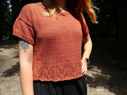 The Furcula tee was inspired by the old wishbone tradition, with the lace resembling wishbones. The tee is knit bottom-up in the round before splitting for the sleeves. I wanted this pattern to work as a lucky charm for everyone, giving everyone the option to make the tee that they feel most comfortable in, whether it's a cropped or full length version, a classic close fit or a relaxed oversized fit. This tee will work great with high waisted jeans, skirts or layered over dresses. The lace section is both written out and charted in the pattern.