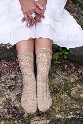 Furlough is a cuff-down sock in 2 sizes with patterned heel-flap and French toe that does not require grafting. The two socks are asymmetrical, featuring a staghorn cable and rib pattern on the first sock and a reverse staghorn cable and rib on the second. These socks will benefit from blocking as the pattern draws in significantly. The design is equally suitable for a man or a woman.