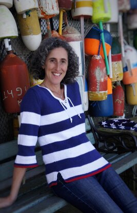YarnWillow YarnsTM Meadow (worsted weight; 100% cotton; 115 yds/50g per ball): Color A, Ocean, #0012 4 (5, 5, 5, 6, 6, 6, 7) balls, Color B White, #0001 4 (4, 5, 5, 6, 6, 6, 7) balls, Color C Poppy, #0012 1 ball