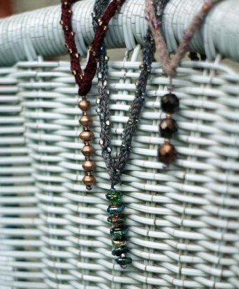 Graceful and pure, infinitely adaptable, Galatea is a stunning lariat neckpiece that is so comfortable to wear you will forget it's on! Begin the necklace with a center fringe of beads, then work a variation of 4-stitch I-cord for the spiral beaded pattern that continues around the neck cord.
