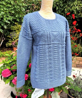 Traditional stitchery is the basis of this beautiful design, reflecting elements of the gansey sweaters of the North East coast of England. A simple shape and very versatile to wear, means this sweater is suitable for both men and women, with optional side slits. The main body is worked bottom up with the sleeves worked top down.