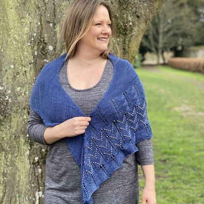 This asymmetric shawl is perfect for long summer evenings in the garden. Knitted in a silk and merino blend, the fabric is lovely and soft, with just the right amount of drape. Shimmering beads dance across chevron lace like lights twinkling through the branches. So string up those lights, call up some friends, put on some music, light the fire pit and let the conversation and laughter flow, it’s what summer nights were made for.