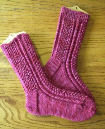 Knit from cuff to toe with an option for a ribbed or wavy top, an easily remembered pattern, eye of partridge heel flap and Dutch heel these are very enjoyable to knit.