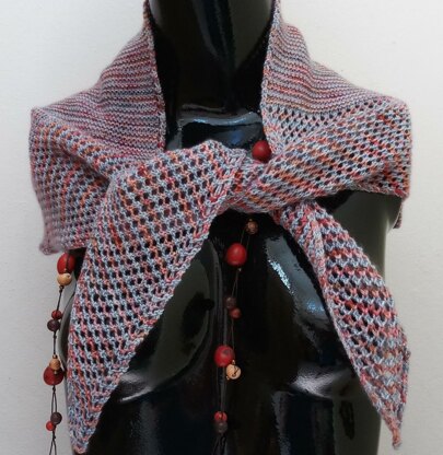 This scarf is an easy knit that yields a unique shape with sections of eyelets, garter stitching, and a central lace medallion. It required slightly less than a half skein of each.