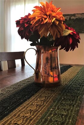 Gathering is a beautiful accent piece for any dining room table, dresser, or sideboard. The runner is knit in individual strips, which allows you to adjust the width easily and play with fun color combinations, and then seamed. This project is perfect for the advanced beginning lace knitter and beyond.