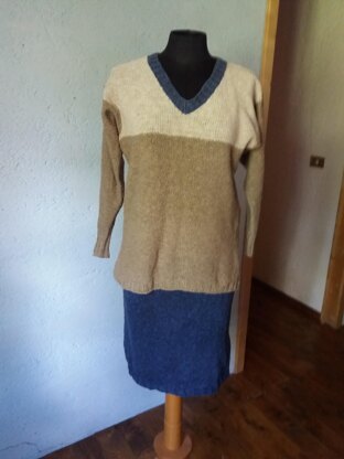 TORRETTA SILK SKIRT with GENEVIEVE - a chic plain coloured skirt iwith a jumper in silk/linen/cotton - a wonderful blend. The skirt is worked in rounds downwards from the waist. The top of the skirt is slightly formed regarding tailoring principles. At the top is space as a tube for putting inside an elastic band for the waist. Beautiful and a smart design to wear with the jumper Genevieve. Also Genevieve is worked in rounds until armholes.