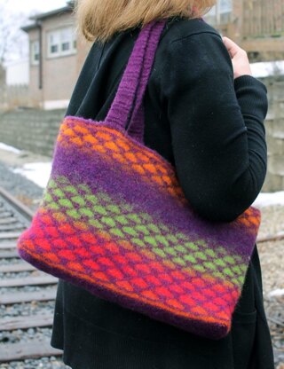 You can carry just about anything in this stylish felted bag. This pattern uses a combination of self striping and solid yarns that make this bag oh so colorful.