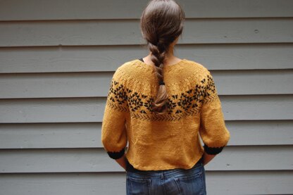 Lightweight and casual with a striking geometric yoke pattern, this sweater is easy and comfortable to wear! Construction is top down in the round with a 2-color stranded yoke. It also has a cute visible increase section before the colorwork. There are instructions for optional short rows in order to raise the back of the neckline.