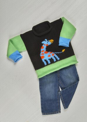 Meet Gerrie the Giraffe, the third in my series of animal motif pullovers. As with the other designs in the series, this sassy giraffe is brimming with personality thanks to embroidered details – who can resist that smirk?! Sitting against the black background, the giraffe motif comes alive. Drop shoulder sleeves and rolled hem and cuffs add a casual feel perfect for kids. Simply knit in stockinette stitch, the motif is worked in intarsia following a chart. This is a multi-sized pattern is designed to fit child 2 through 8 years.