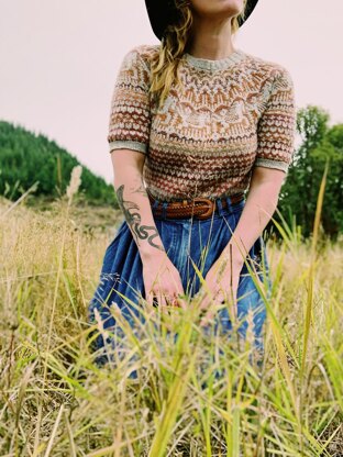 Ghost Horses is a top-down circular yoke sweater featuring all-over stranded colorwork. This sweater was a dream I have had in mind for a few years; I love the ring of horses galloping across the yoke! The pattern is written to be easily customizable in sleeve and body length. Options are given for short or long sleeves.
