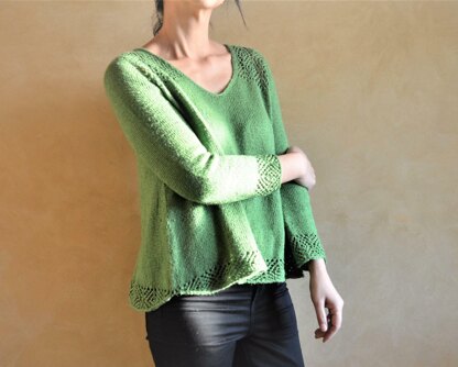 This top is begun with a provisional cast-on at the upper back, then worked back and forth to the shoulder top. The right and left yokes are divided for working separately until they are joined at the base of the V-neck. The front and back yokes are worked separately to the underarm. The body is worked in the round until the hem. The Sleeves are picked up around the armhole and worked in the round from the top down. This top includes lots of short-rows to shape the shoulders, the neckline, the hem and the cap sleeves.